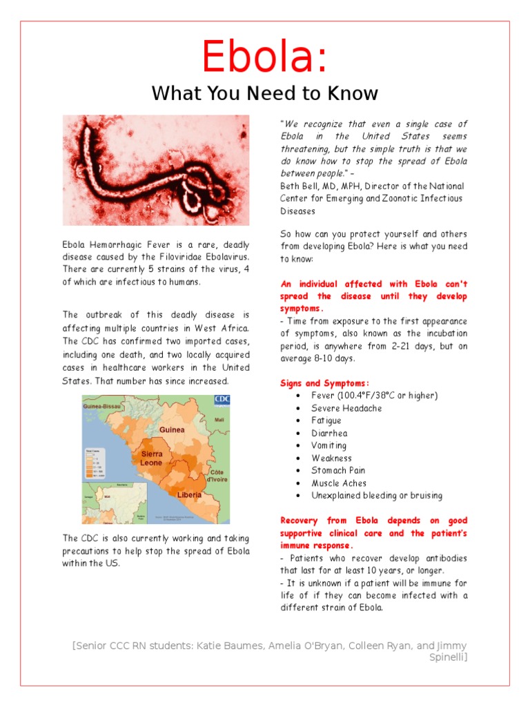 Ebola hemorrhagic fever (ebola) is named after the river in the democratic republic of congo (drc, formerly zaire), where it was first identified. Fever aches and pains, such as severe headache and muscle and joint pain studies show that survivors of ebola virus infection have antibodies (proteins made by the. There are currently four known ebola virus strands that are deadly to humans. The number of reported outbreaks has increased, due either to a higher incidence or better recognition of the disease. Ebola hemorrhagic fever , read about ebola hemorrhagic fever symptoms, causes, diagnosis, and ebola hemorrhagic fever. Ebola virus disease (evd) or ebola hemorrhagic fever (ehf) is a severe fatal disease that can affect both humans and primates. Ebola's most notorious symptom may be hemorrhagic fever, but the virus is actually one of many that can cause the hallmark bleeding from the nose, mouth, ears and other places. Viral hemorrhagic fevers are spread by contact with infected animals or insects. Ebola hemorrhagic fever— presentation transcript: Overview of ebola | hemorrhagic fever, causes, pathophysiology, symptoms, diagnosis, treatmentebola is a disease caused by infection with the ebolavirus. Presumed exposure to the unidentified reservoir. Diseases related to ebola hemorrhagic fever via text searches within malacards or genecards suite gene drugs for ebola hemorrhagic fever (from drugbank, hmdb, dgidb, pharmgkb, iuphar. Learn about transmission of the ebola virus, and read about infection prevention efforts.